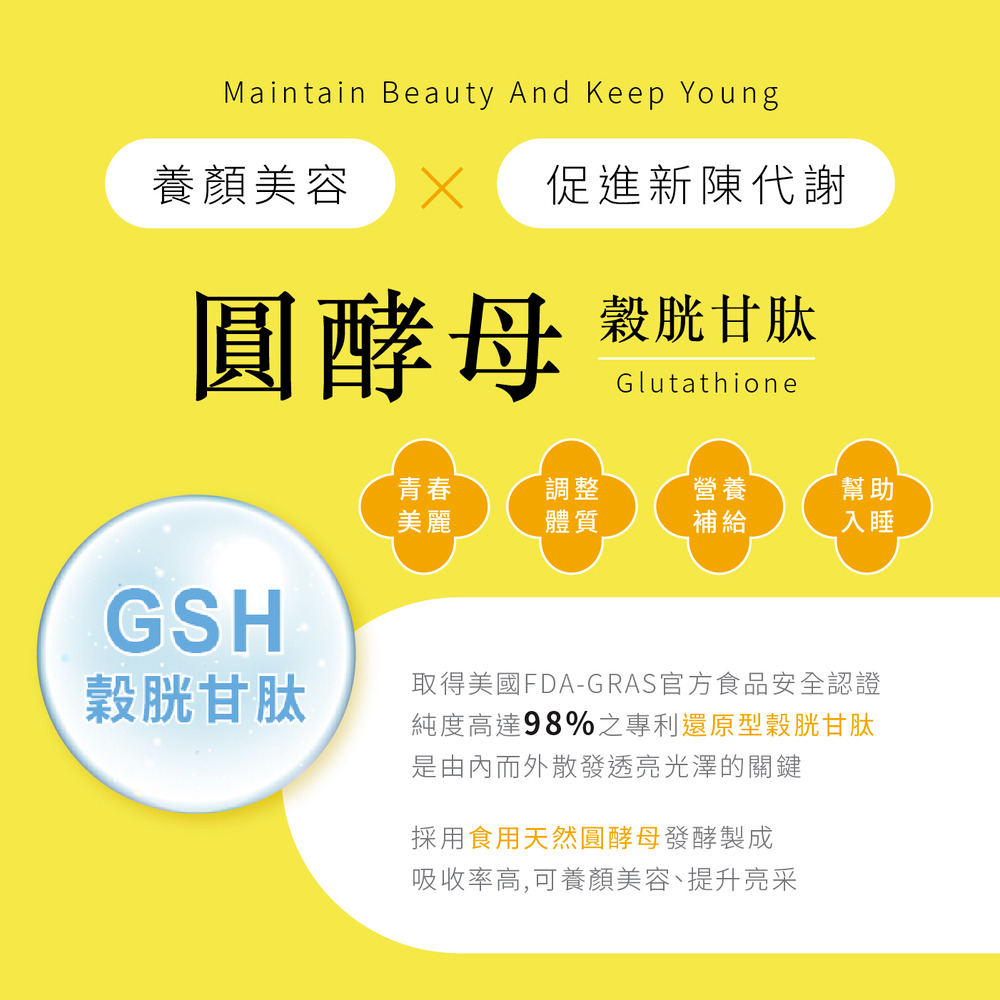 1.圓酵母穀胱甘肽,可促進新陳代謝,是由內而外散發透亮的關鍵